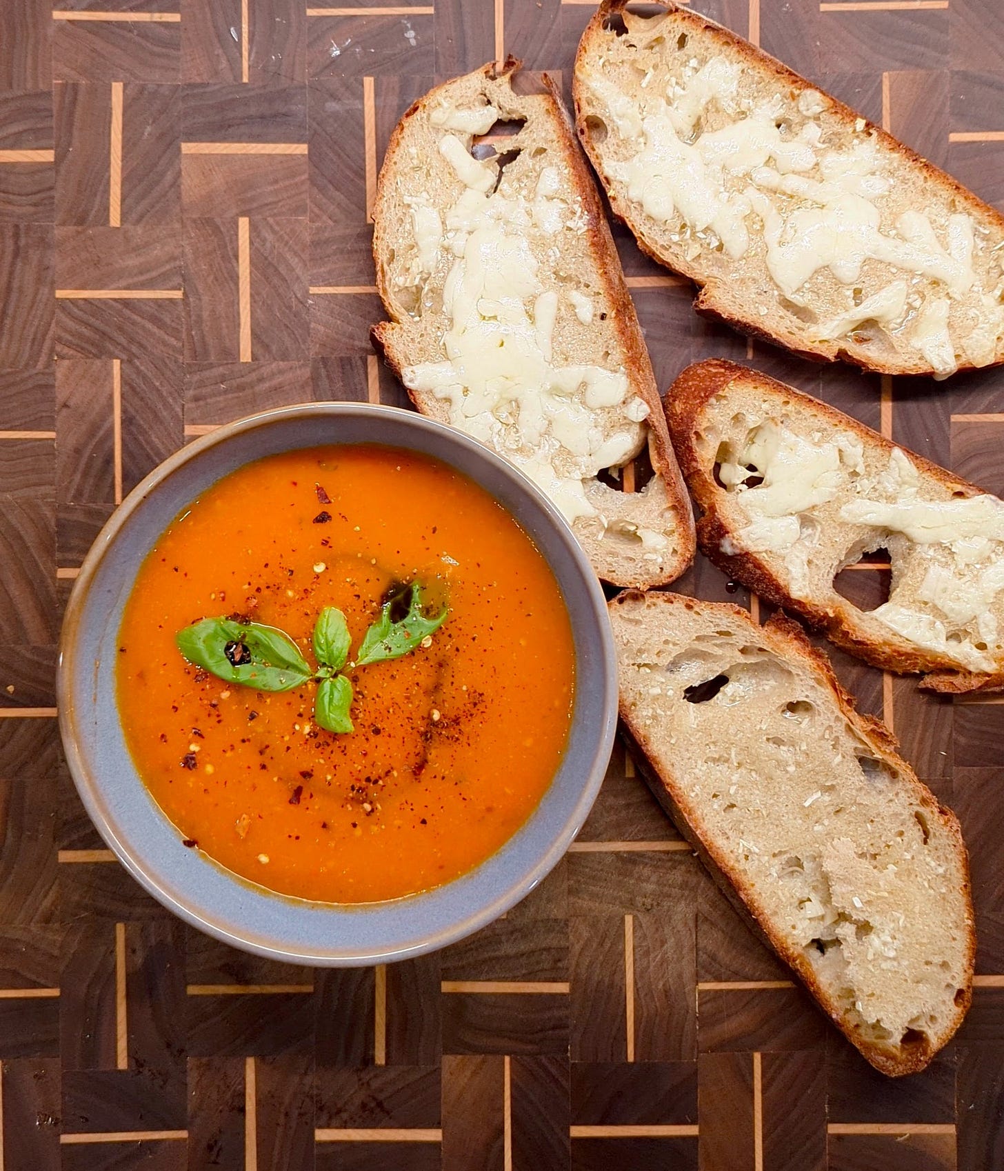 A simple soup for when weather the weather gets chilly (because we don’t get cold in Houston). My family’s preference is to pair the soup with crusty bread as opposed to grilled cheese; the bread functions like soup croutons and I love the texture it provides when the bread soaks in the soup while you dip and munch. Serve with a drizzle of balsamic vinegar, fresh cracked pepper and a sprig of fresh basil. Also serve with your protein of choice on the side. This recipe serves 4 as a main and 6 if being served as a side dish.